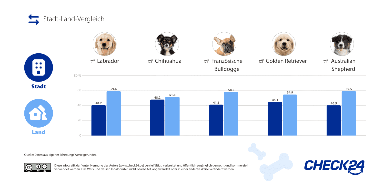 In diesem Jahr gibt es auf dem Land weiterhin deutlich mehr Hunde als in der Stadt. An der Spitze der ländlichen Rangliste stehen erneut der Labrador auf Rang eins und der Australian Shepherd auf Rang zwei. Beide Rassen bestätigen damit ihre starke Verankerung außerhalb urbaner Räume.