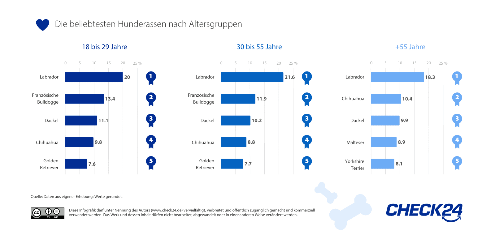 In der Altersgruppe der über fünfundfünfzigjährigen bleibt der Labrador ebenfalls unangefochten an der Spitze. Der Chihuahua hält seinen zweiten Platz, während der Dackel neu auf den dritten Rang klettert. Der Malteser steigt auf den vierten Platz. Neu in den Top Fünf ist der Yorkshire Terrier, der den fünften Platz einnimmt. Der Golden Retriever und der Jack Russell Terrier, die im vorigen Jahr noch vertreten waren, gehören in dieser Altersgruppe dieses Mal nicht mehr zu den fünf beliebtesten Rassen.