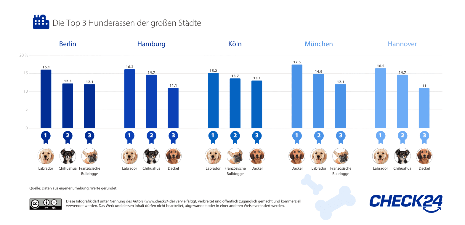 Hannover erlebt ebenfalls einen Wechsel auf Rang drei. Labrador und Chihuahua bleiben unverändert auf den ersten beiden Plätzen, doch der Dackel schafft neu den Sprung unter die Top Drei. Der Golden Retriever verliert dadurch seinen bisherigen Platz auf dem Podium.