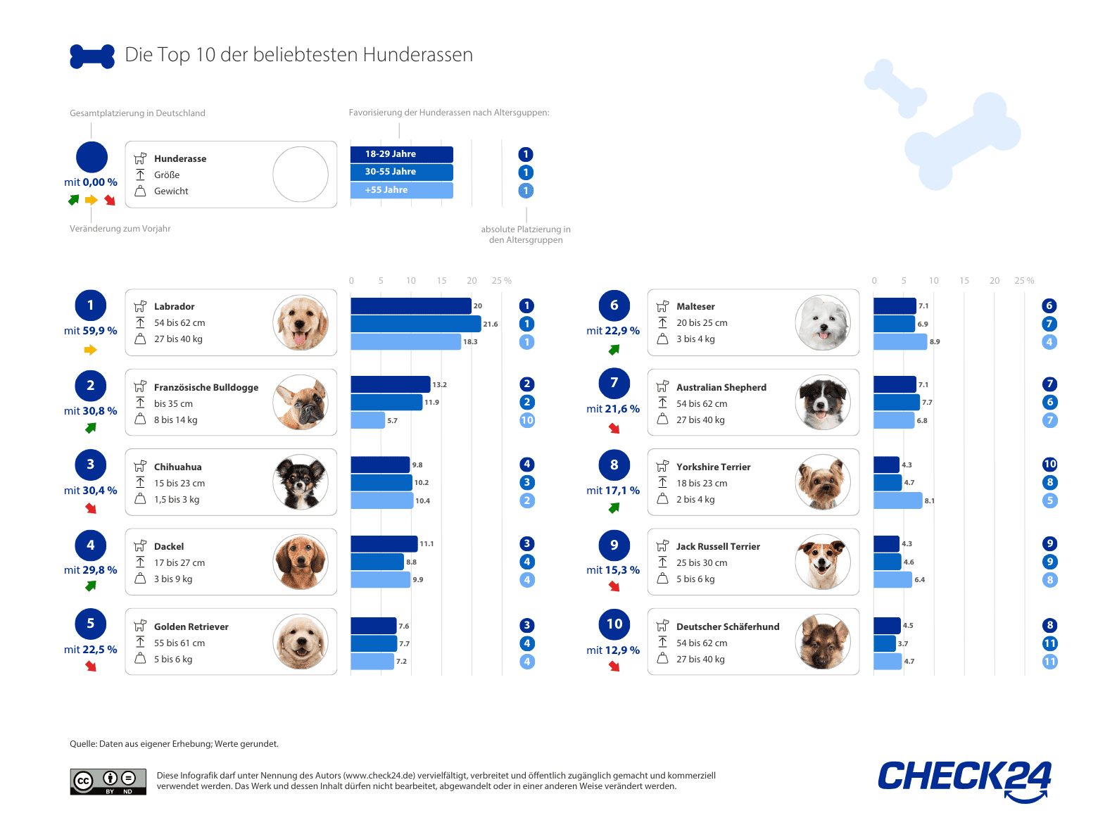 | Deutscher Schäferhund | 10 ↓ | 8 ↑ | 9 ↓ | 8 ↓ | 7 - | 7 - | 7 ↓ | 6 ↑ | 7 ↓ |