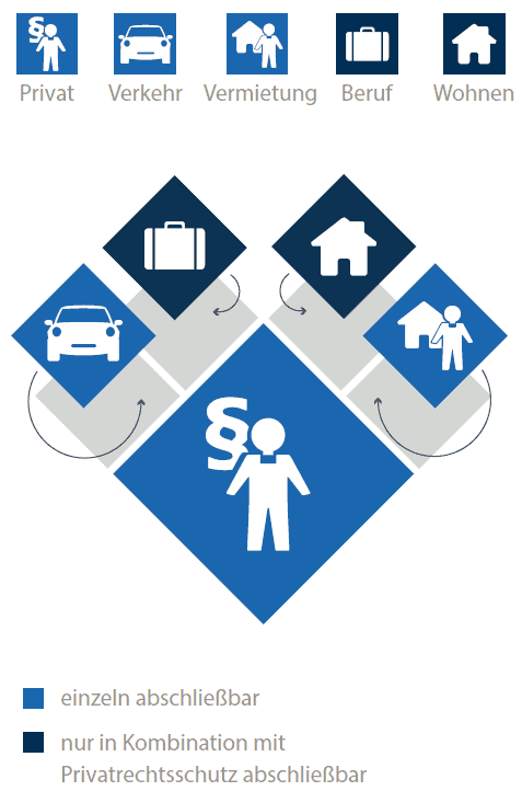 Der Privatrechtsschutz kann wahlweise einzeln oder zusammen mit anderen Bausteinen der Rechtsschutzversicherung abgeschlossen werden: