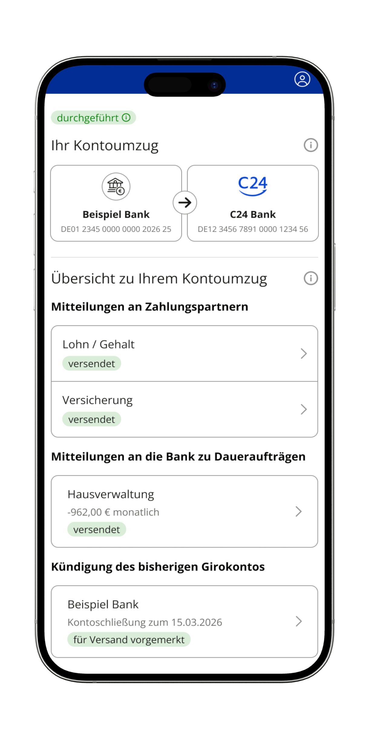 - Mit Ihrem Einverständnis wird Ihre neue IBAN an relevante Unternehmen, zum Beispiel Ihren Arbeitgeber, und Personen übermittelt und auf Wunsch das bisherige Konto gekündigt.