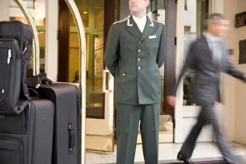 Ein Pförtner steht vor der Tür eines Hotels.Alle anderen bekommen höchstens eine geringe staatliche Erwerbs­min­derungsrente  (EM-Rente) ausgezahlt, wenn sie weniger als sechs beziehungsweise drei Stunden täglich arbeiten können. Bei weniger als sechs Arbeitsstunden spricht man von einer teilweisen, bei weniger als drei Stunden von einer vollen Erwerbsminderung.