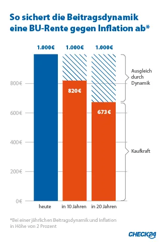 Beitragsdynamik - BUVerbraucherschützer empfehlen grundsätzlich, rund 80 Prozent des Netto­einkommens als Berufsunfähigkeitsrente abzusichern. Wer aktuell beispiels­weise 2.000 Euro netto verdient, sollte demnach eine BU-Rente in Höhe von 1.600 Euro vereinbaren. Für ein Nettoeinkommen von 3.000 Euro sollte die BU-Rente entsprechend 2.400 Euro hoch sein.