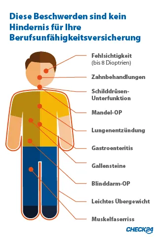 Erkrankungen, die oftmals zu einer Ablehnung führen, sind zum Beispiel psychische Krankheiten, Bulimie, Angina Pectoris oder Epilepsie. Einige Krankheiten führen zu einem Ausschluss, das heißt sie werden vom Berufsunfähigkeitsschutz ausgenommen. Dazu gehören etwa Schuppenflechte, Neurodermitis, ein Hörsturz oder Bandscheibenvorfall.