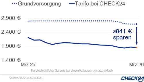 Aktuell liegt der Gaspreis bei 11,04 ct pro Kilowattstunde (kWh). Jedoch können sich die Gaspreise bei verschiedenen Gasanbietern täglich verändern. Deshalb empfehlen wir regelmäßig den CHECK24 Gaspreisvergleich durchzuführen, um herauszufinden, wann der beste Zeitpunkt für einen Gasanbieterwechsel für Sie ist.
