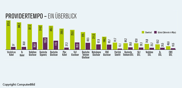 Die schnellsten DSL-Bandbreiten wurden beim Zweitplatzierten Telekom gemessen: Im Schnitt surfen Telekom-Kunden mit einer Bandbreite von 84,2 MBit/s. Dies ergibt sich laut ComputerBild insbesondere durch das Angebot schnellerer Tarife.