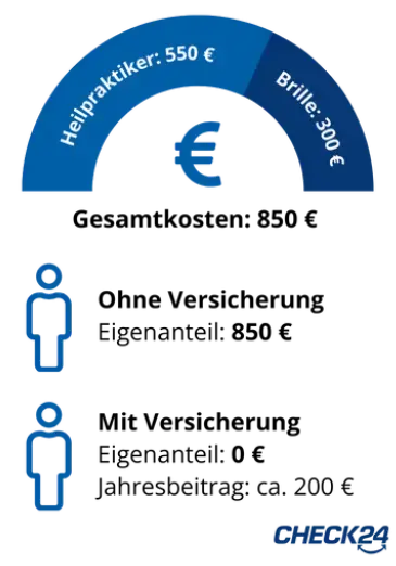 Die Tarife übernehmen häufig einen Anteil von 50 bis 100 Prozent der Kosten versicherter Bausteine. Meist gibt es dabei eine jährliche Erstattungsgrenze, die je nach Tarif unterschiedlich hoch ausfällt. In jedem dieser Fälle lässt sich mit einer ambulanten Zusatzversicherung Geld sparen: