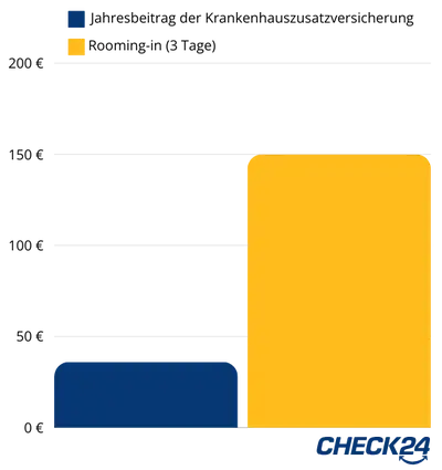 Kostenvergleich des Jahresbeitrags für eine Krankenhauszusatzversicherung und 3 Tage des Rooming-ins ohne Versicherung (Daten aus dem CHECK24 Vergleich, gerundete Werte, Stand: 04/2025)