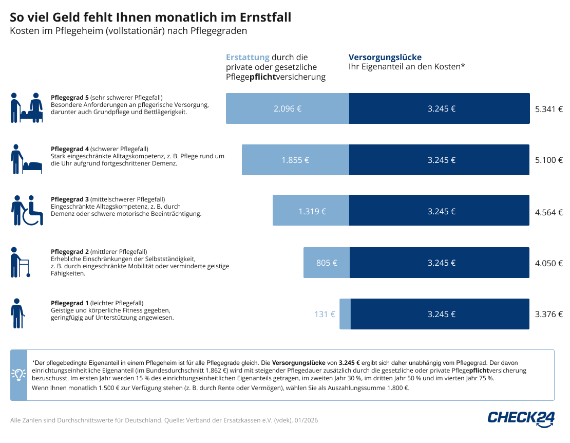 Bei vollstationärer Pflege in Pflegegrad 2 bis 5 wird der Eigenanteil seit 2022 mit steigender Pflegedauer zusätzlich durch die gesetzliche oder private Pflegepflichtversicherung bezuschusst. Im ersten Jahr der Pflegebedürftigkeit werden 15 % des pflegebedingten Eigenanteils getragen, im zweiten Jahr 30 %, im dritten Jahr 50 % und ab dem vierten Jahr 75 %. Für die prozentuale Berechnung dieses Zuschusses wird nur der pflegebedingte Eigenanteil herangezogen. Dieser beträgt im Bundesdurchschnitt 921 € monatlich. Die Unterbringungs-, Investitions-, Ausbildungs- und Verpflegungskosten werden dabei nicht berücksichtigt.