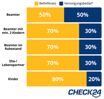 Der Standardbeihilfesatz für aktive Beamte beträgt 50 Prozent der Gesundheitskosten. Für die verbleibenden 50 Prozent müssen Sie eine private Krankenversicherung abschließen. Beamte mit mindestens zwei Kindern erhalten einen erhöhten Beihilfesatz von 70 Prozent. Gleiches gilt für Beamte im Ruhestand.